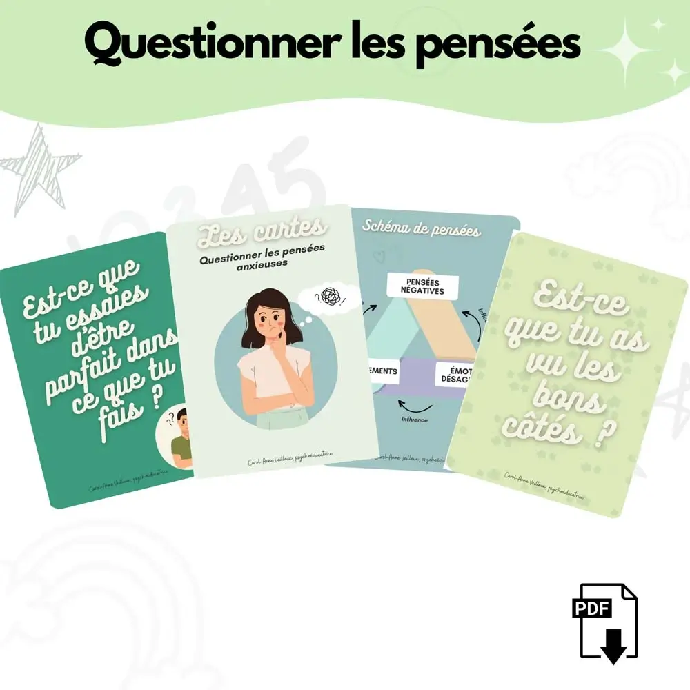 Les 4 cartes pour questionner les pensées anxieuses sont un outil pratique pour aider les adolescents et autres personnes souffrant d’anxiété à identifier et à remettre en question leurs pensées négatives et irrationnelles.