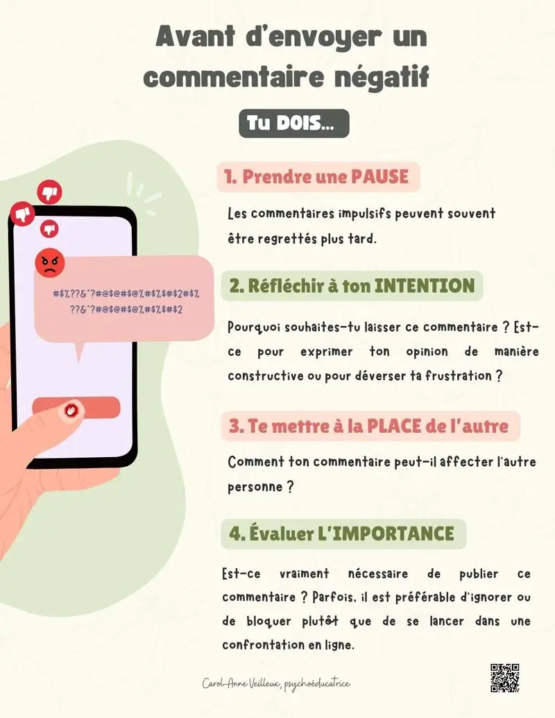 Cette affiche est un outil éducatif utile pour aborder le sujet de la communication en ligne, de la réflexion avant de commenter et de la manière de créer un environnement en ligne plus respectueux. Elle encourage à adopter une approche réfléchie et empathique dans nos interactions sur les médias sociaux et les plateformes en ligne.