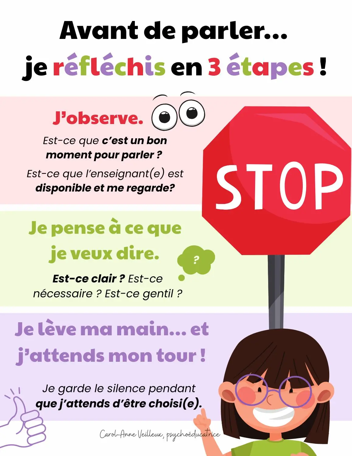🛑 Avant de parler… je réfléchis en 3 étapes ! – Une affiche visuelle pour enseigner l’autocontrôle et le respect du tour de parole en classe