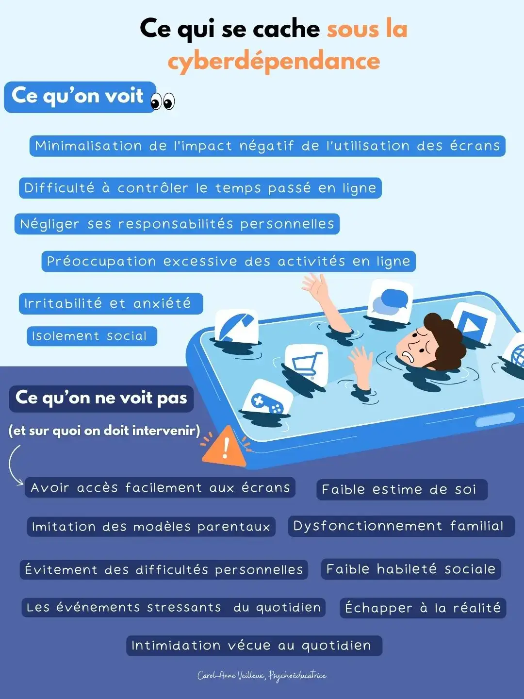 - Sensibilisation : Informer sur les aspects visibles et invisibles de la cyberdépendance.