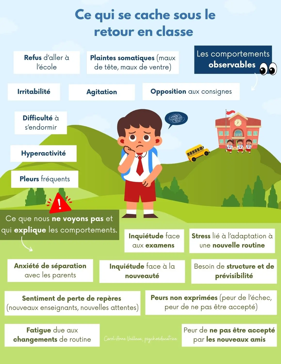 Naviguer la rentrée scolaire peut être une source d’anxiété pour les enfants, entraînant des comportements qui peuvent sembler inexplicables à première vue. Cette affiche éducative vous permet de décoder les signaux que les enfants peuvent envoyer en période de retour en classe, afin de mieux comprendre leurs besoins et les soutenir efficacement. Conçue par une psychoéducatrice expérimentée, elle présente les comportements observables (comme l’agitation, l’irritabilité, les plaintes somatiques) et les raisons sous-jacentes (comme l’anxiété face à la nouveauté, la peur de ne pas être accepté, ou le besoin de structure).