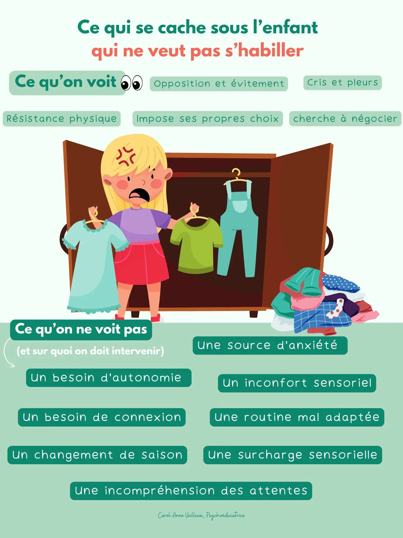 Découvrez une affiche psychoéducative unique et visuellement attrayante qui explore les défis derrière les comportements d’un enfant qui refuse de s’habiller. Cet outil aide à décomposer ce qu’on observe — comme les cris, l’opposition ou la négociation — pour mieux comprendre les causes sous-jacentes souvent invisibles. Grâce à un visuel clair et engageant, cette ressource offre aux parents et intervenants des pistes concrètes pour identifier des besoins comme l’autonomie, la connexion ou encore l’adaptation de la routine.