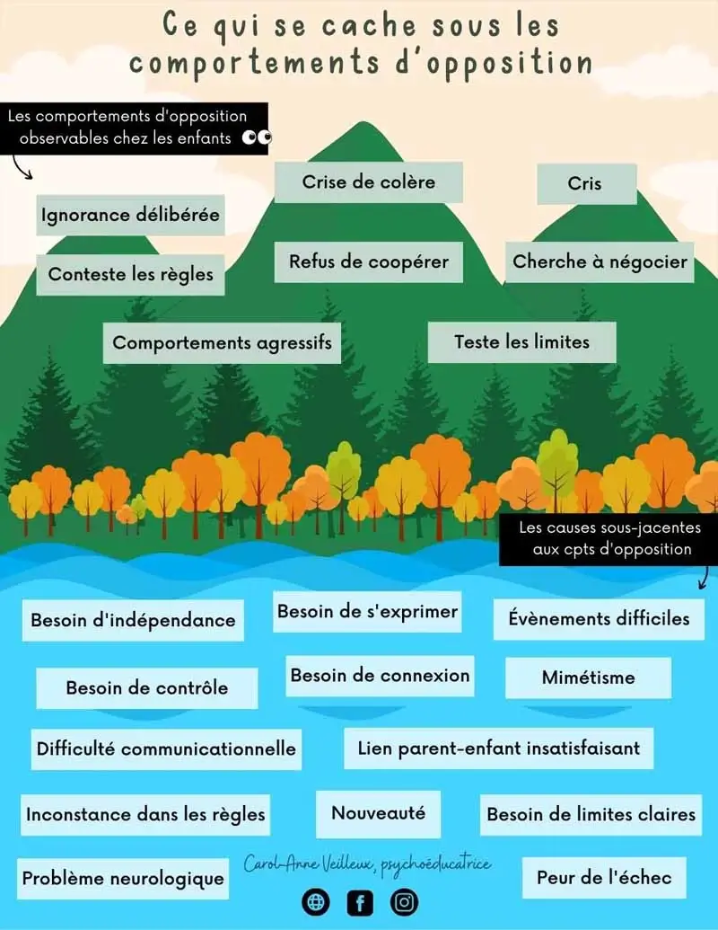 Cette affiche illustre comment les comportements d’opposition sont souvent des signes extérieurs de besoins intérieurs non satisfaits. Lorsque nous, en tant qu’adultes, comprenons ces besoins sous-jacents, nous pouvons mieux aider les enfants à surmonter leurs défis.