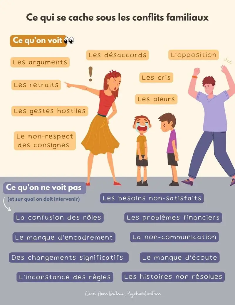 En bas, « Ce qui se cache sous les conflits familiaux (et sur quoi on doit intervenir) » révèle les éléments invisibles mais critiques qui alimentent ces conflits, notamment les besoins non satisfaits, les problèmes financiers, l’inconstance des règles, les histoires non résolues, la non-communication, la confusion des rôles, le manque d’écoute, et le manque d’encadrement.