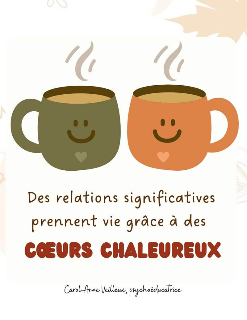 Sous l’image des tasses de café, vous trouverez le message clé : « Des relations significatives prennent vie grâce à des cœurs chaleureux. » Cette citation rappelle que ce sont nos émotions, notre ouverture et notre bienveillance envers les autres qui nourrissent et fortifient nos relations.