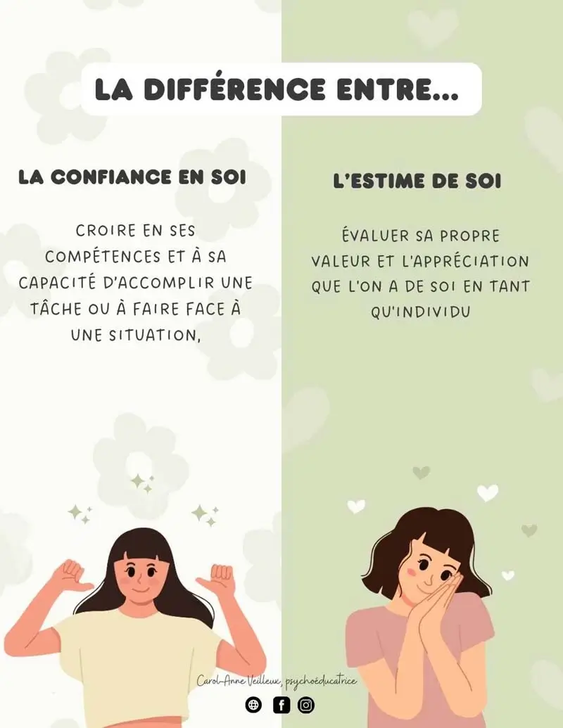 D’un côté, nous avons l’estime de soi, qui se réfère à l’évaluation de sa propre valeur et à l’appréciation que l’on a de soi en tant qu’individu unique. C’est un sentiment profondément enraciné qui forme la base de notre identité et de notre amour-propre. De l’autre côté, la confiance en soi est mise en avant, représentant la croyance en ses compétences et en sa capacité à accomplir des tâches spécifiques ou à faire face à des situations particulières.