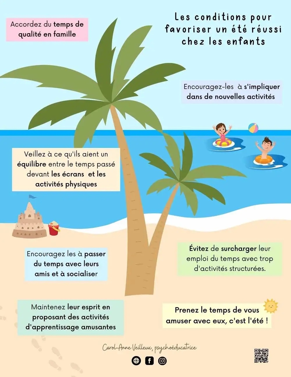 En utilisant cette affiche, les parents, les éducateurs et les adultes responsables peuvent se rappeler l’importance de ces conditions pour favoriser un été réussi chez les enfants. En fournissant un équilibre entre les moments en famille, les loisirs non structurés et les opportunités sociales, les enfants peuvent profiter pleinement de cette saison estivale et en retirer des bénéfices durables.