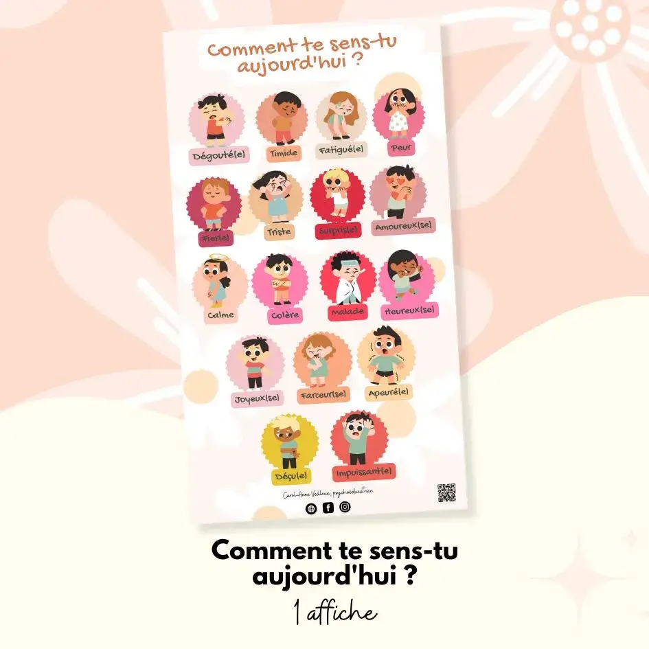 Cette affiche est un outil d’intervention conçu pour aider les enfants à exprimer leurs émotions et à développer leur intelligence émotionnelle. Les petits dessins découpables permettent aux enfants de choisir les émotions qui correspondent le mieux à leur ressenti du moment.