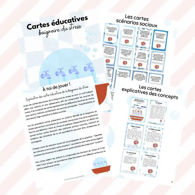 21 cartes (6 cartes explicatives + 15 cartes scénarios sociaux) pour explorer le stress à travers des situations concrètes du quotidien