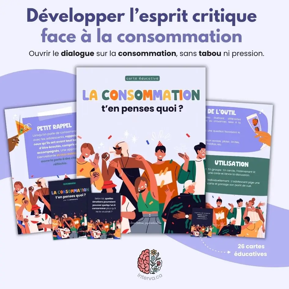 Ce jeu de 26 cartes éducatives est spécialement conçu pour aborder la thématique délicate de la consommation (alcool, drogues, etc.) avec les adolescents. À travers des questions ouvertes, il permet de développer l’esprit critique, d’explorer les perceptions et croyances entourant la consommation, et d’encourager une discussion saine et constructive. L’objectif est d’outiller les jeunes pour qu’ils réfléchissent à leurs choix, sans pression ni jugement.