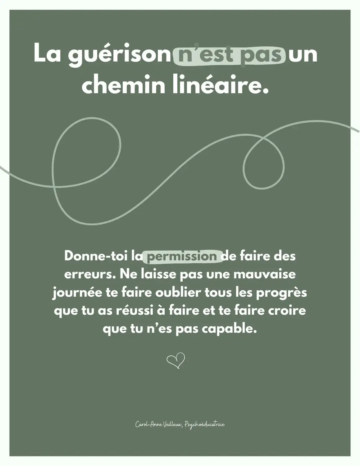 L’affiche « La Guérison n’est pas un Chemin Linéaire » offre une perspective réconfortante et essentielle sur le processus de guérison personnelle. Elle rappelle de manière élégante que la route vers la guérison est souvent sinueuse et parsemée de défis, et encourage à adopter une approche patiente et indulgente envers soi-même.