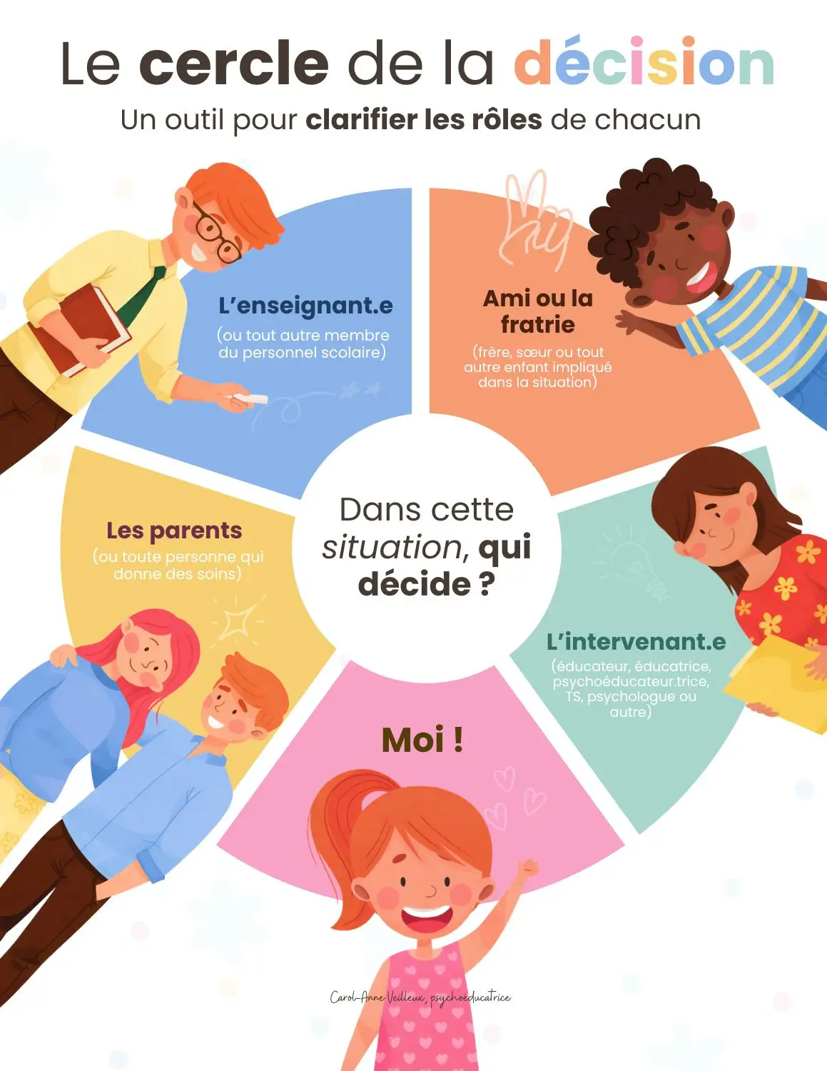 L’affiche propose un visuel en cercle divisé en six sections, représentant les principaux acteurs qui peuvent être impliqués dans une prise de décision : l’enfant lui-même, les parents, l’enseignant.e, l’intervenant.e, un ami ou un membre de la fratrie. En plaçant la question centrale « Dans cette situation, qui décide ? », elle invite à la réflexion, au dialogue et à la clarification, autant pour les enfants que pour les adultes.