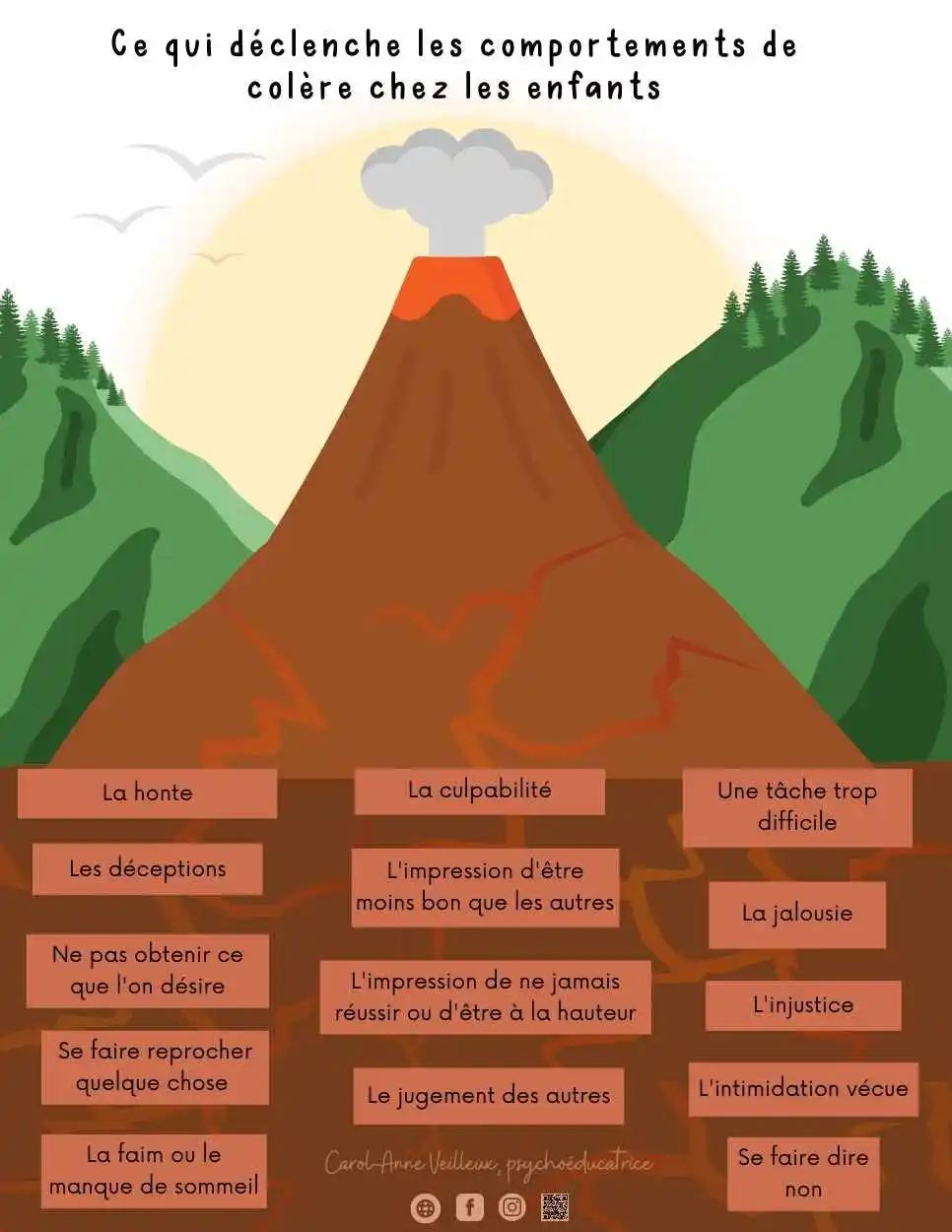 En résumé, l’affiche « Le Volcan de la Colère » illustre les différents facteurs qui déclenchent les comportements de colère chez les enfants, symbolisés par le magma du volcan. La honte, la culpabilité, les tâches difficiles et la jalousie sont quelques exemples de ces facteurs. En comprenant ces déclencheurs, nous pouvons aider les enfants à mieux gérer leur colère, à développer des compétences d’autorégulation émotionnelle et à trouver des moyens plus positifs pour exprimer et gérer leurs émotions.