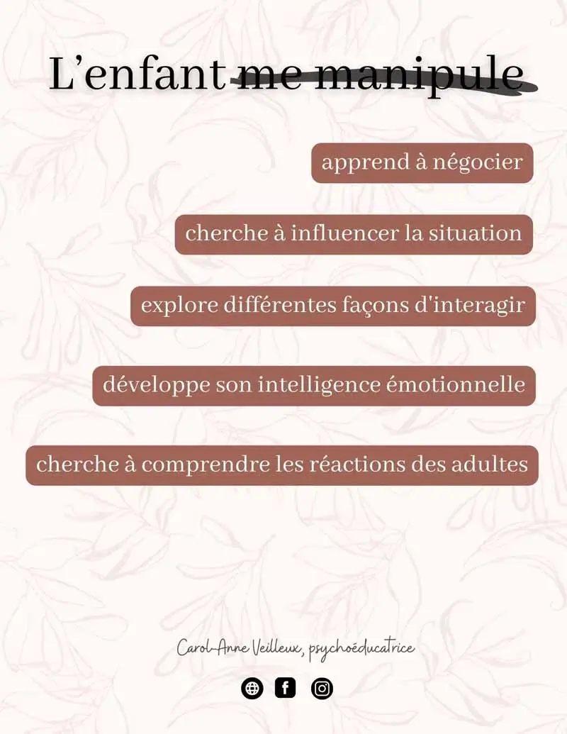 Cette affiche vise à encourager une réflexion sur les comportements des enfants. Elle invite à remplacer la notion de manipulation par des méthodes qui favorisent la communication, la négociation et le développement des compétences émotionnelles. Les approches alternatives suggérées visent à aider les enfants à s’exprimer, à comprendre leurs émotions et à apprendre des compétences sociales, plutôt que d’accuser de manipulation.
