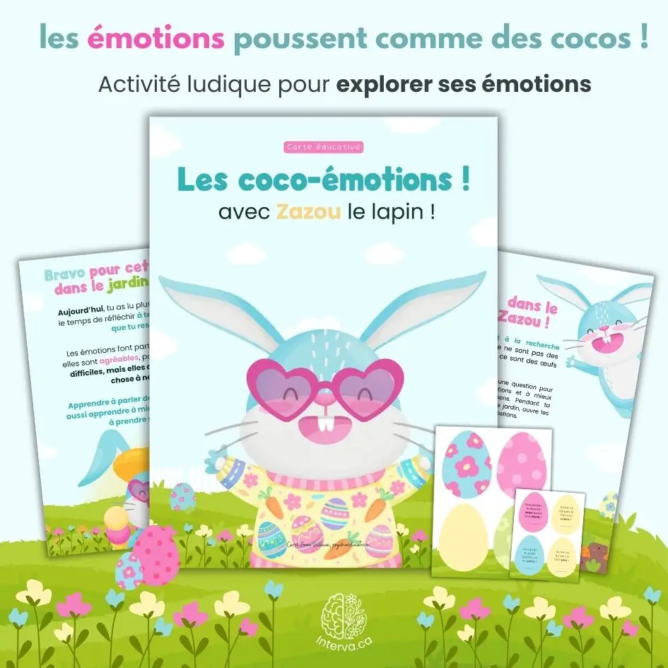 Partez à la découverte du monde des émotions avec Les coco-émotions avec Zazou, un outil d’intervention engageant qui invite les enfants à explorer ce qu’ils ressentent à travers une activité interactive et thématique. Dans cet univers doux et coloré, les enfants accompagnent Zazou le lapin dans une chasse aux cocos bien spéciaux… car chaque coco contient une question qui les amène à réfléchir à leurs émotions. Comme expliqué dans le guide d’introduction , chaque œuf cache une invitation à mieux comprendre ce qui se passe dans leur cœur et dans leur tête, sans pression ni bonne ou mauvaise réponse.