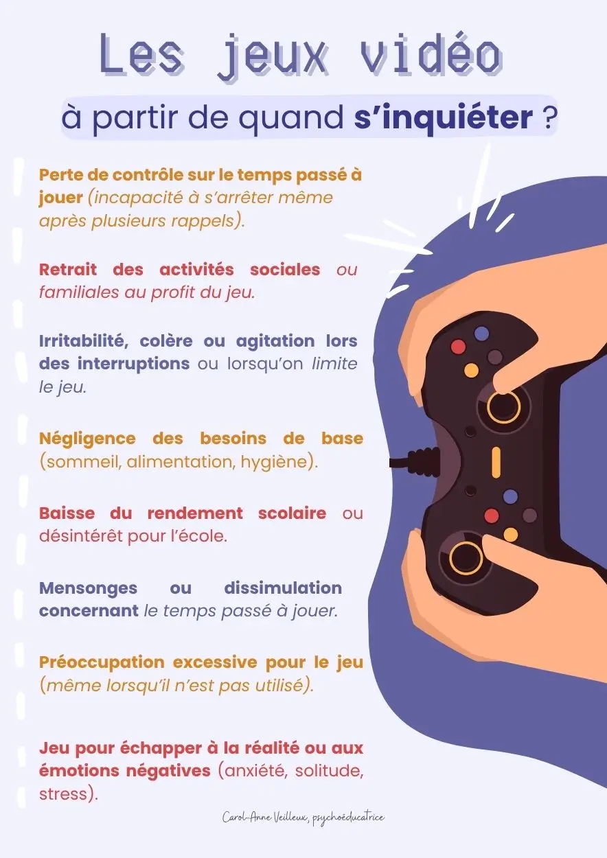 🎮 Les jeux vidéo – À partir de quand s’inquiéter ? Une affiche claire pour repérer les signes de dépendance