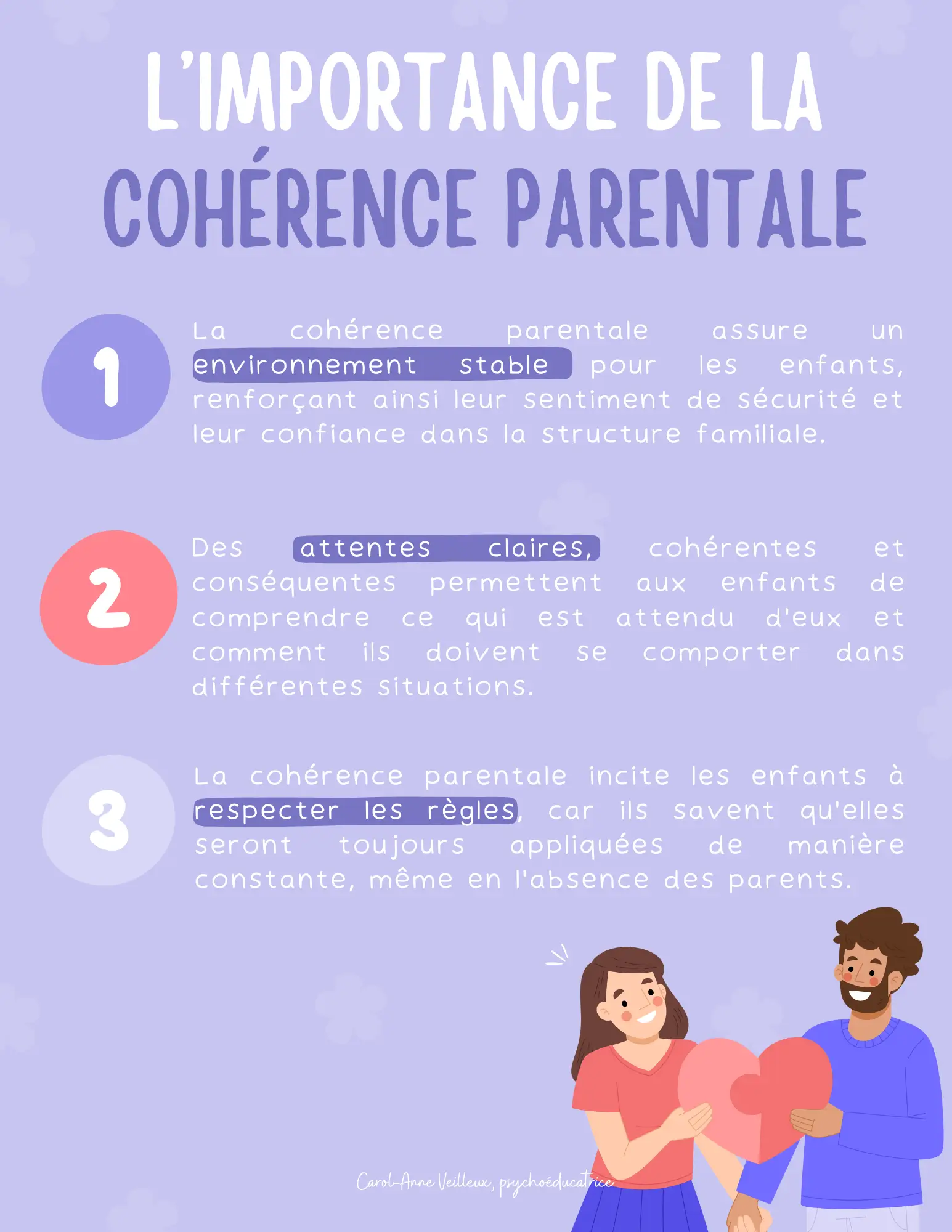 Cette affiche met en évidence l’importance de maintenir une cohérence parentale dans l’éducation des enfants.