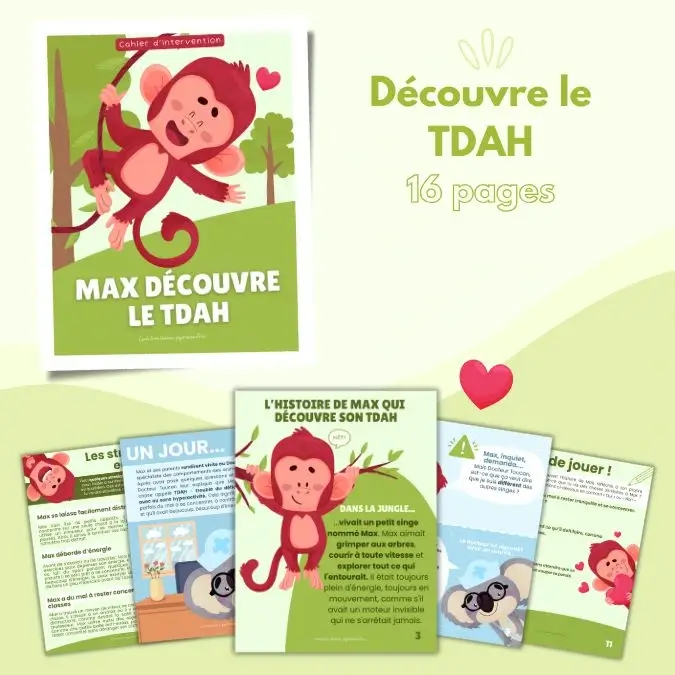 Ce cahier d’intervention de 16 pages plonge les enfants dans l’univers de Max, un petit singe débordant d’énergie qui découvre son TDAH. À travers une histoire captivante et accessible, les enfants peuvent mieux comprendre ce que signifie vivre avec ce trouble, tout en apprenant des stratégies concrètes pour gérer leur quotidien. Conçu comme un outil d’accompagnement, ce cahier engage les enfants par le biais de questionnaires interactifs et de jeux, leur permettant de s’identifier aux défis de Max, tout en développant des outils pratiques pour mieux se concentrer, gérer leurs impulsions et améliorer leur bien-être.