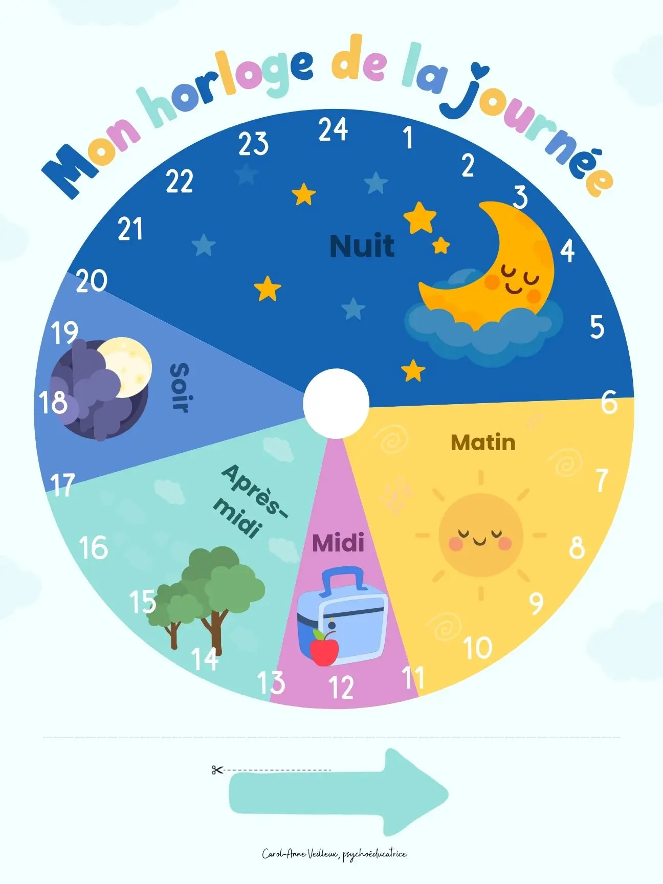 1 flèche à découper pour indiquer l’heure actuelle ou la prochaine étape de la journée