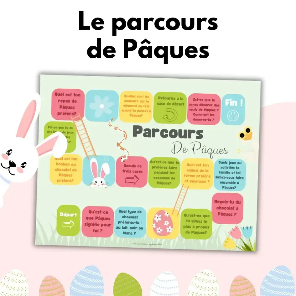 Les joueurs avancent sur un parcours parsemé de cases contenant des questions et des actions liées à Pâques. Les éléments du jeu incluent des questions telles que « Quel est ton repas de Pâques préféré ? » ou « Est-ce que tu aimes décorer des œufs de Pâques ? », ainsi que des actions telles que « Recule de trois cases » ou « Retourne à la case de départ ».