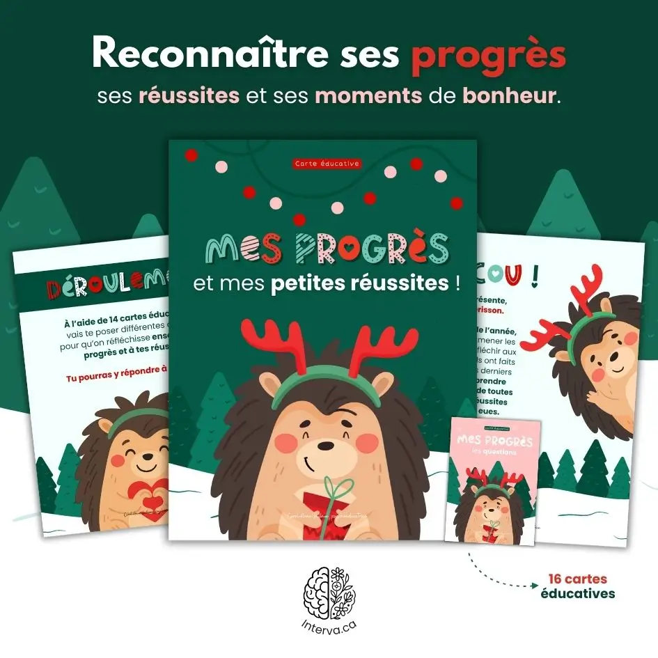 Offrez aux enfants un moment doux, rassurant et profondément valorisant grâce au jeu de cartes Mes progrès et mes petits réussites, une ressource psychoéducative conçue pour aider les jeunes à reconnaître ce qu’ils ont accompli tout au long de l’année. Guidés par Élie l’hérisson, un personnage attachant et festif illustré sur les pages du document , les enfants sont invités à réfléchir à leurs forces, à leurs réussites, à leurs améliorations, mais aussi aux petits moments de bonheur qui ont jalonné leur parcours. Le visuel coloré, hivernal et chaleureux plonge immédiatement l’enfant dans une atmosphère de bienveillance, encourageant un climat propice à l’autoréflexion positive.