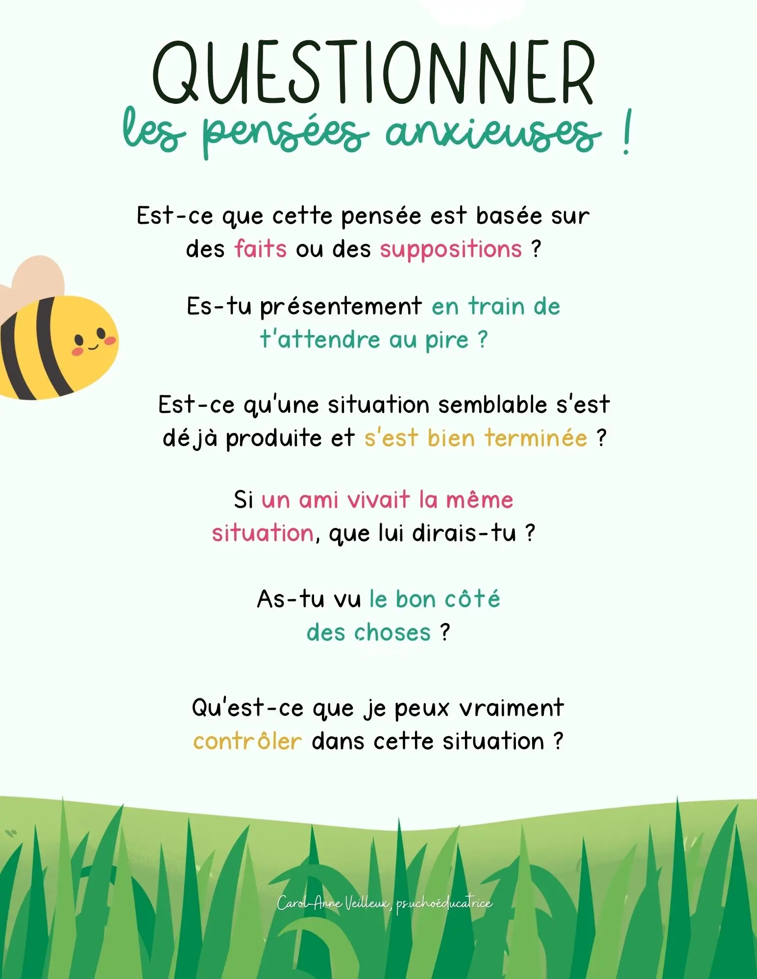 Affichez le visuel dans un endroit accessible et invitez le jeune à s’y référer lorsqu’il ressent de l’anxiété. Il peut lire les questions une à une et y répondre à voix haute ou dans sa tête. L’adulte peut aussi accompagner la réflexion en reprenant les questions et en soutenant l’exploration.