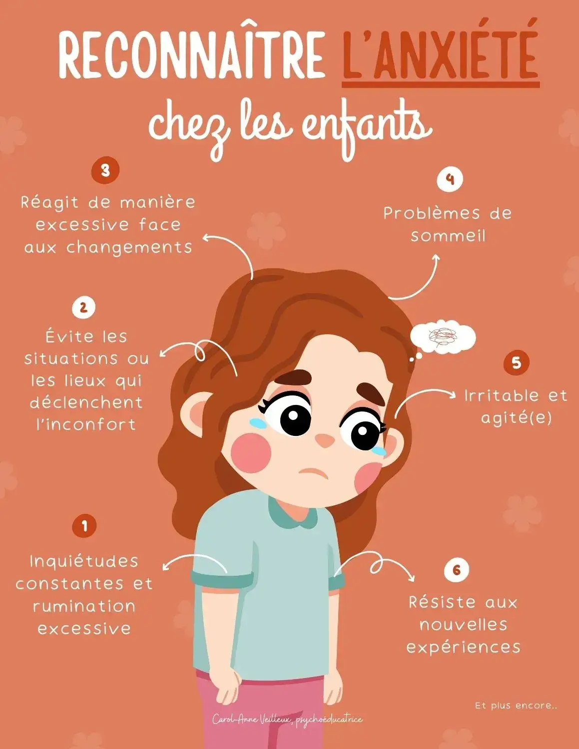 Cette affiche informative, intitulée « Reconnaître l’Anxiété chez les Enfants », vise à sensibiliser les parents, éducateurs et intervenants aux signes courants d’anxiété chez les enfants.