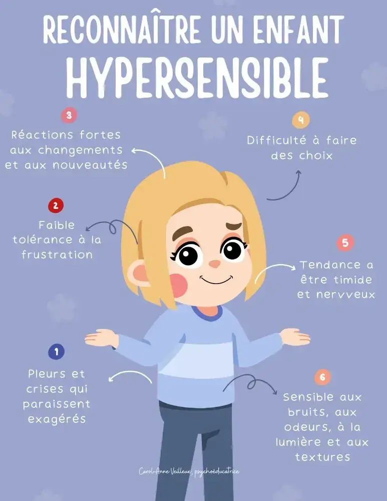 L’affiche éducative « Reconnaître un Enfant Hypersensible » met en lumière les caractéristiques de l’hypersensibilité chez les enfants. Le titre, centré autour de la phrase éponyme, est accompagné d’une image représentant un enfant démontrant des signes d’hypersensibilité.