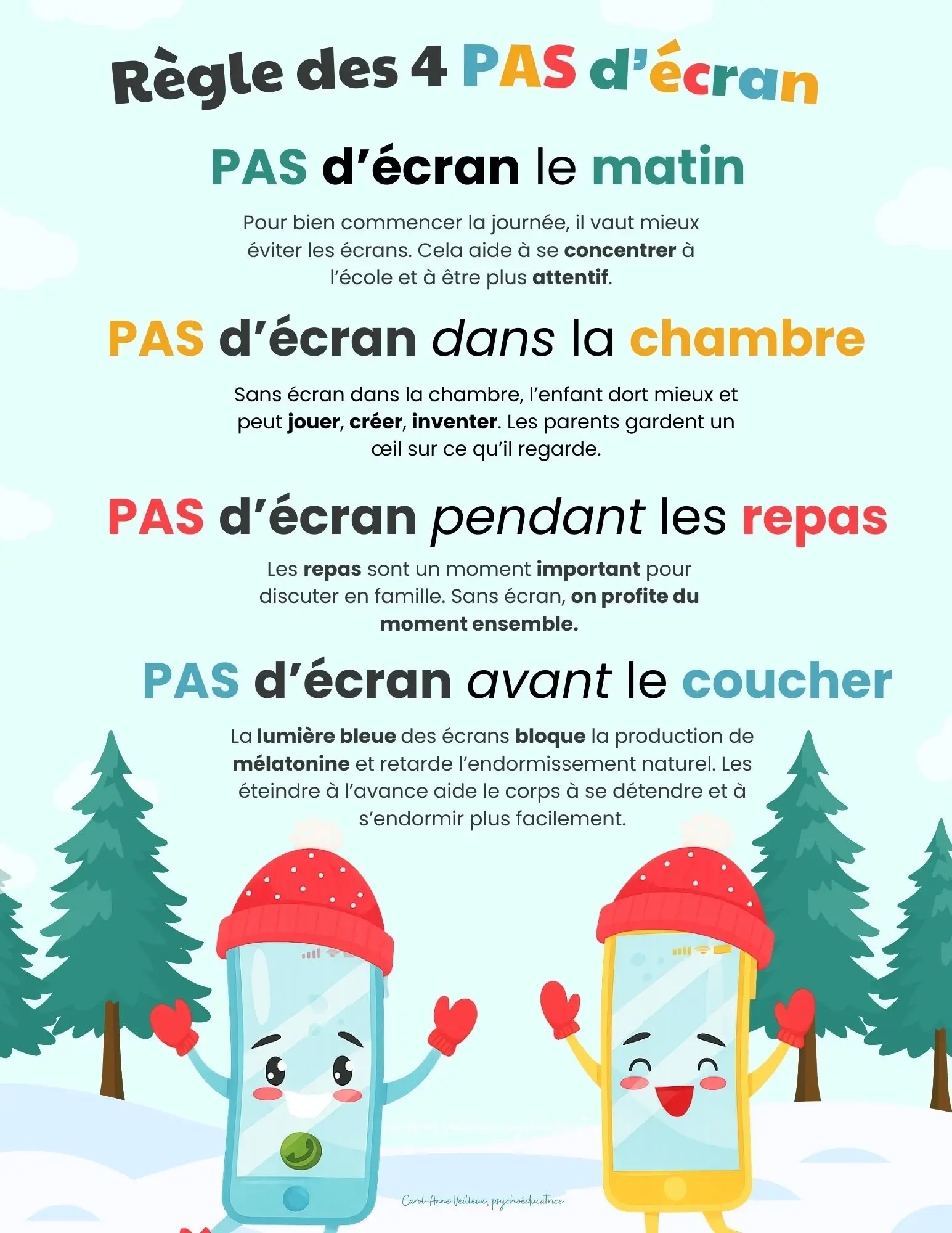 Les 4 PAS d’écran présentés de manière claire : le matin, dans la chambre, pendant les repas et avant le coucher. Des explications simples et accessibles qui soutiennent la compréhension des jeunes. Un visuel hivernal accrocheur avec deux personnages téléphones attachants qui rendent le message attrayant . Une section de références scientifiques provenant de sources reconnues (AAP, CPS, recherches sur la lumière bleue).
