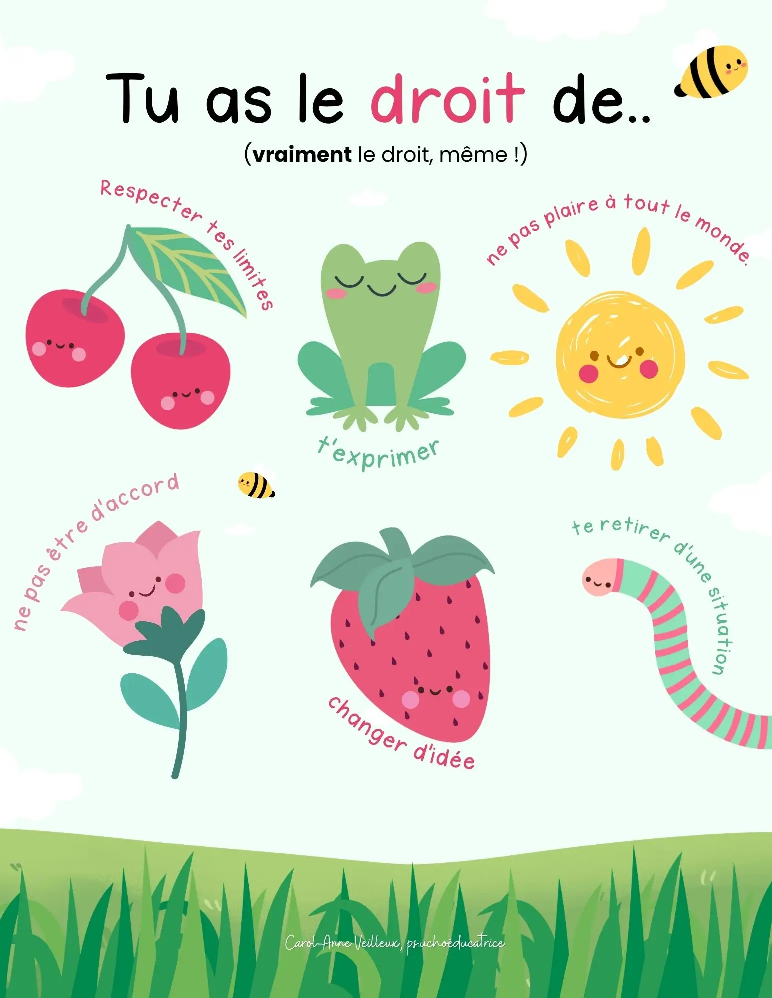 Imprimez l’affiche et placez-la dans un endroit visible comme une chambre, une classe ou un bureau. Elle peut être utilisée comme point d’ancrage lors de discussions, ou comme rappel visuel dans des moments où l’enfant doit prendre une décision ou exprimer un inconfort.