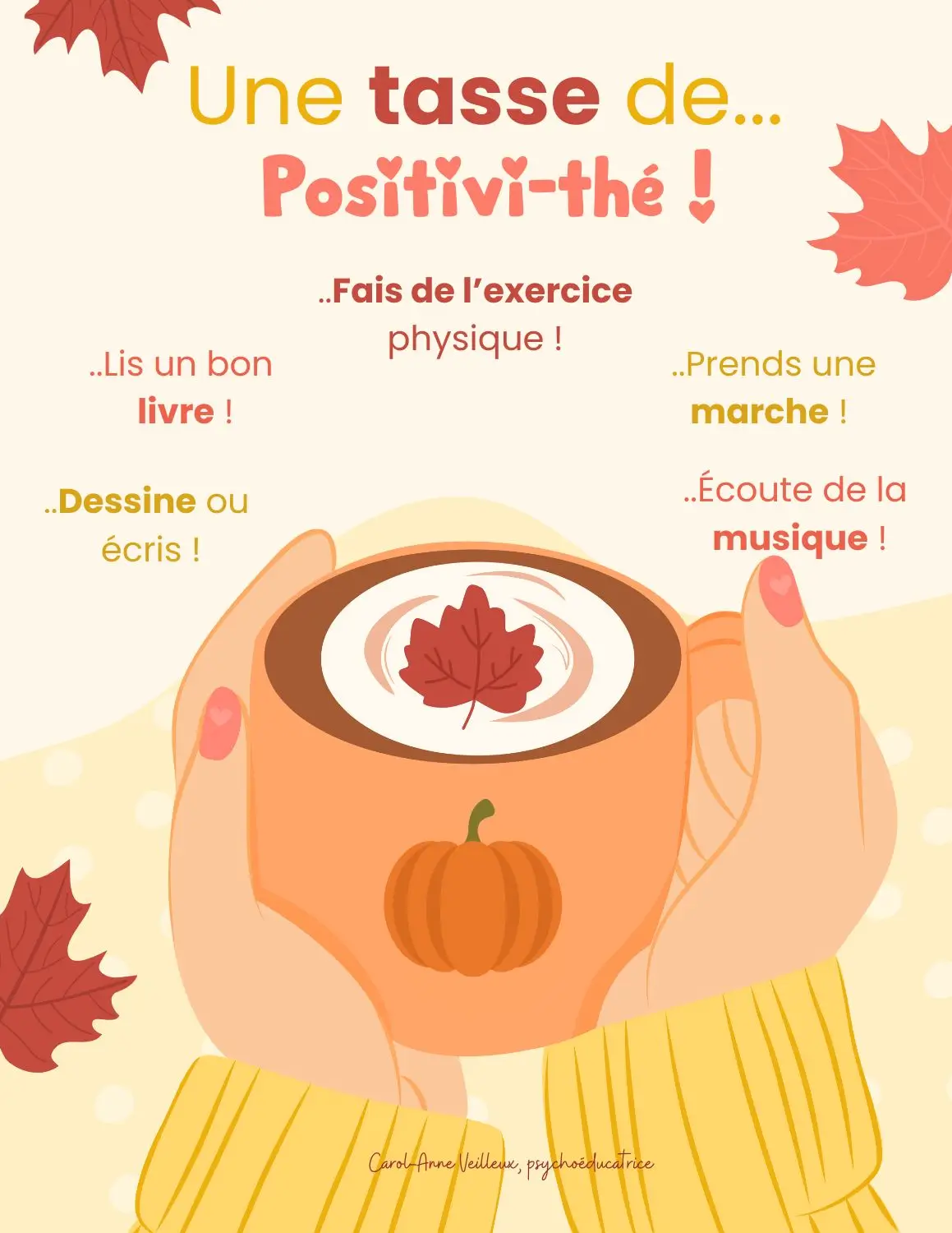 Affichez-la dans une classe, un bureau d’intervention, une salle d’attente, une chambre ou un coin lecture. Elle peut aussi servir de point de départ pour proposer aux enfants de choisir une “tasse de Positivi-thé” chaque jour comme défi bien-être.