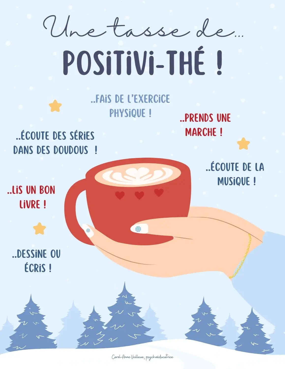 L’affiche « Une tasse de Positivi-thé » est un outil chaleureux et réconfortant, parfait pour insuffler un vent de positivité et d’apaisement au quotidien. Avec des suggestions simples et accessibles comme écouter de la musique, dessiner ou écrire, ou encore prendre une marche, cette affiche invite à des moments de bien-être personnel et à cultiver une mentalité positive. Ses illustrations hivernales et douces créent un environnement visuel réconfortant, idéal pour des espaces éducatifs ou thérapeutiques.